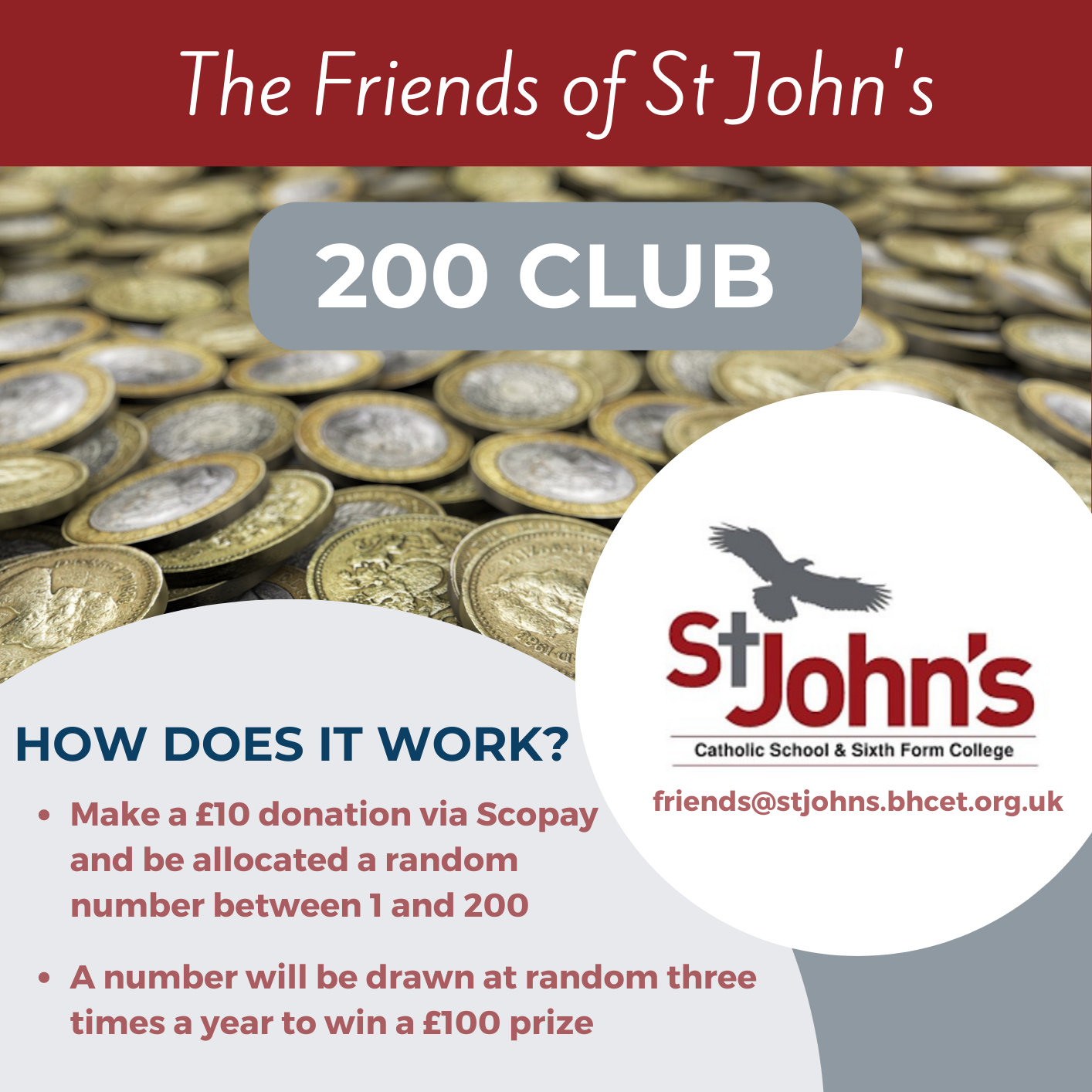 We would like to invite parents/carers to support the Friends of St John's by joining our 200 Club. For £10 per year you have the chance to win three prizes of £100 each.
